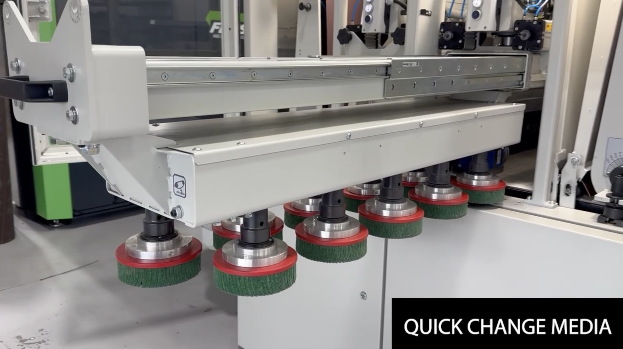 FINISHLINE machines are available in multiple working widths and working units can be configured to your specific needs. Each system can include a combination of abrasive belts, rotary brushes, top brushes, and barrel brushes to achieve the desired finish quality for your application.