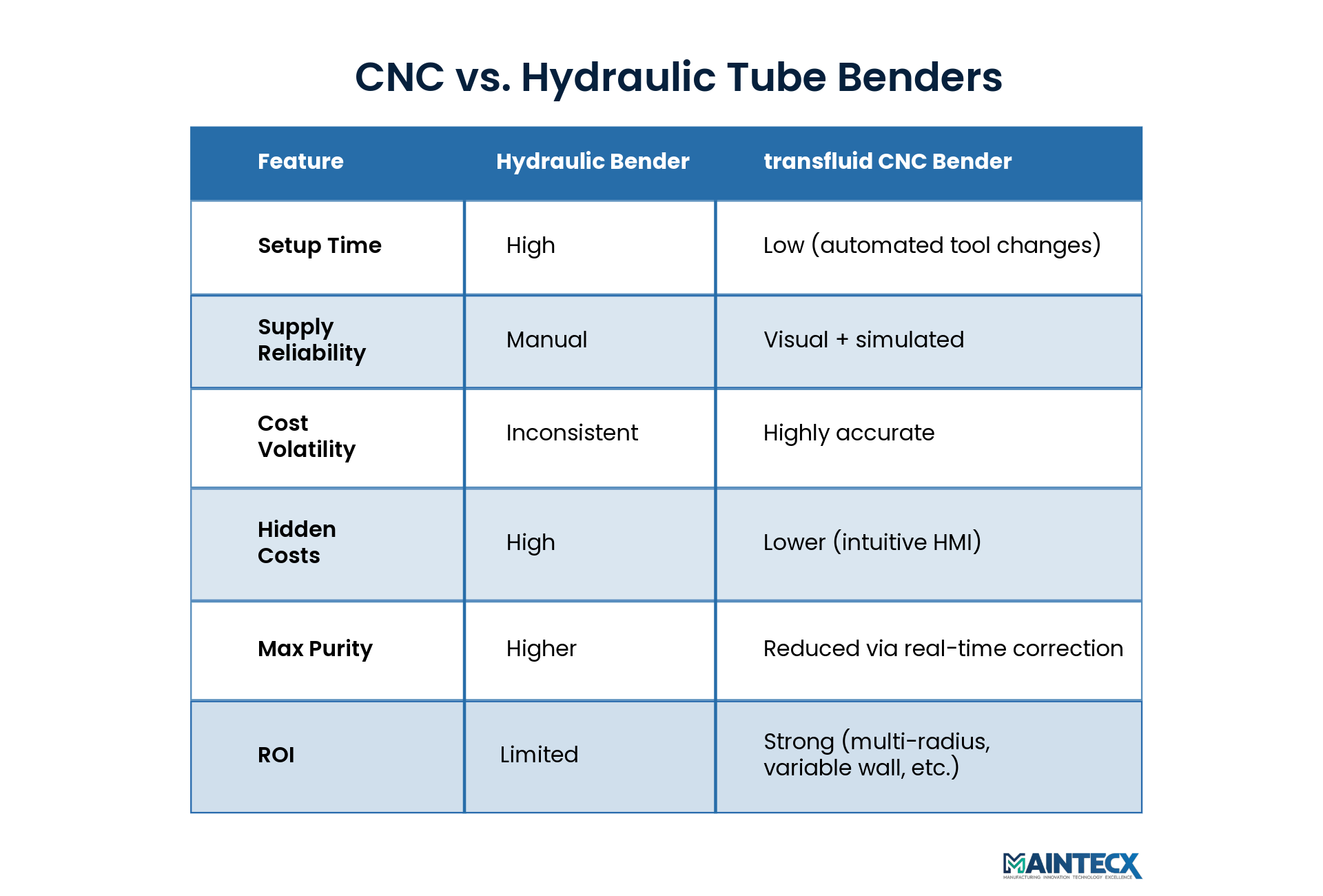Whether you’re trying to simplify programming, cut scrap rates, or adapt to evolving part designs, transfluid delivers the precision and speed traditional hydraulic or even older CNC benders can’t match. Here’s what sets them apart, and how Maintecx can help you bring that power to your shop.